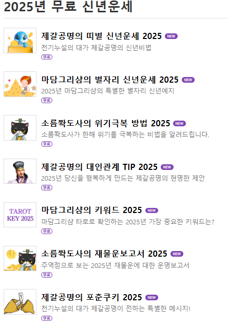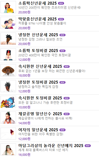 위키사주에서 새롭게 출시한 상품은 총 11가지로, 나에게 일어날 모든 일을 알 수 있는 '소름쫙 신년운세 2025', 내 나이와 상황에 맞는 맞춤형 신년운세인 '딱 맞춤 신년운세 2025', 상반기와 하반기 개별 풀이와 10개의 카테고리 해설이 담긴 '소름쫙 토정비결 2025' 등이 있다. 이 외에도 '냉정하고 솔직한 쪽집게 감정', '후련한 토정비결', '출사표 비책', '타로 예지', '핵심 분석' 등 다양한 신년운세를 재미있게 점칠 수 있다.