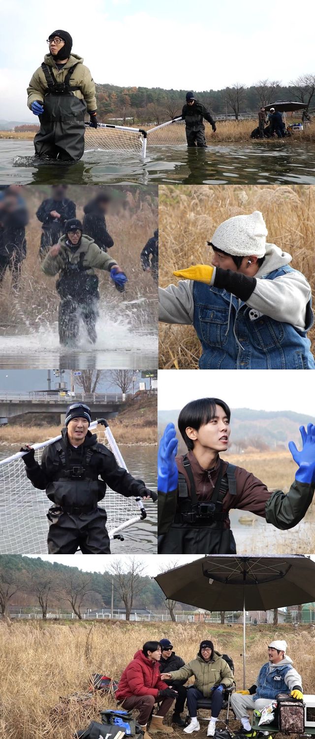 공개된 사진 속 유재석은 한 손에 골대를 쥐고 비장하게 물고기를 잡으러 입수하고 있다. 낚시를 위한 전투복(?)을 입고, 두꺼운 장갑, 장화까지 착용한 그들의 완전 무장한 모습이 눈길을 끈다. 그냥 낚시일 뿐인데, 전투적으로 고기잡이에 임하는 이들의 모습이 벌써부터 웃음을 유발한다.