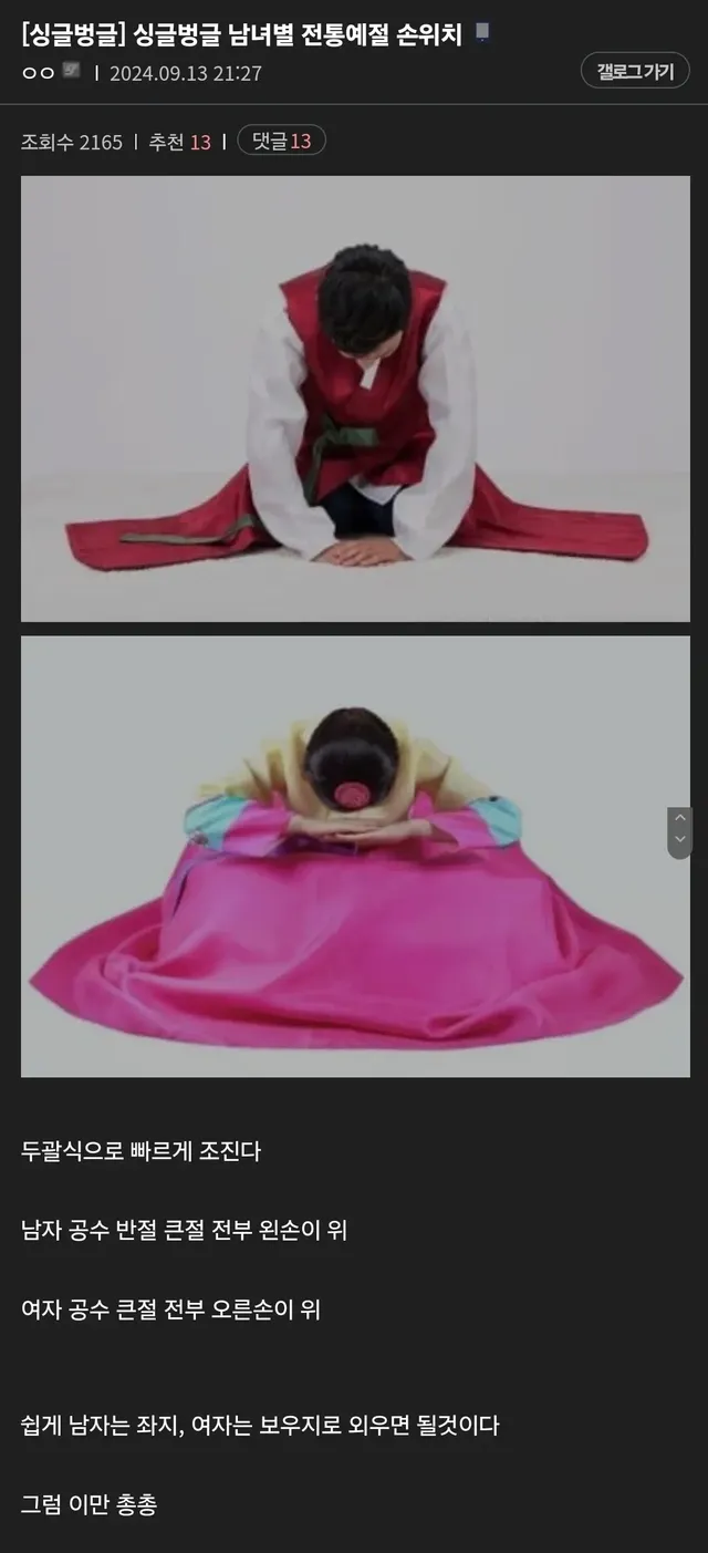 남자는 좌지(왼손이 위) 여자는 보우지(오른손이 위)