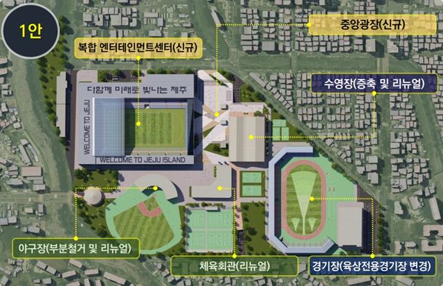 2안은 1안의 컨셉에서 야구장을 완전히 철거해 상업용 임대시설을 배치하고 축구경기장의 사업규모를 줄여 사업비를 5655억원대로 낮췄고 3안은 기존 시설물을 대부분 남겨두고 주경기장과 한라체육관 시설만 보강하는 것으로 사업비는 1976억원이다.
