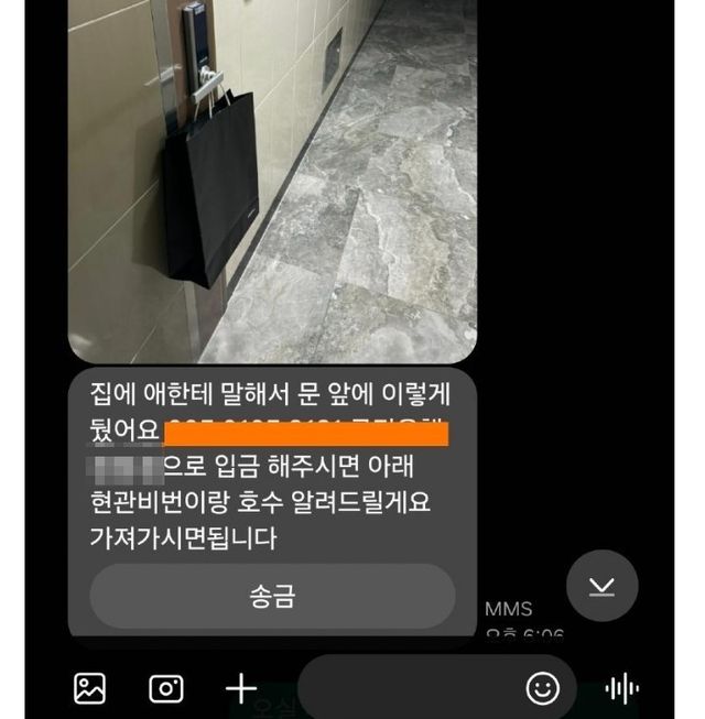 보배 회원 A씨는 “갤럭시 S24 미개봉 제품이 싸게 올라와서 사겠다고 했더니 특정 시간에 자기 아파트로 오라고 했다”고 운을 뗐다. 이어 “약속 장소에 도착하니 사정이 생겨 문고리에 걸어놨다며 선입금해주면 호수 알려준다고 하더라”며 “며칠 전 비슷한 사기를 조심하라는 글을 본 적이 있어 바로 사기임을 직감했다”고 설명했다.