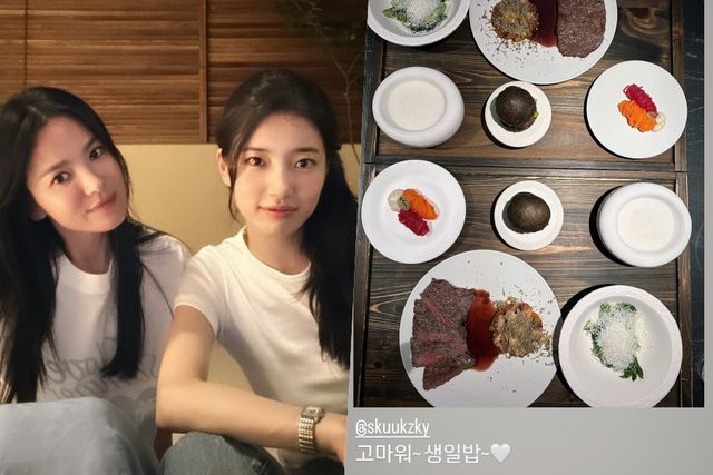 29일 송혜교가 자신의 SNS에 수지를 태그하며 "고마워~ 생일밥~♥"이라는 글과 함께 사진을 게재했다.