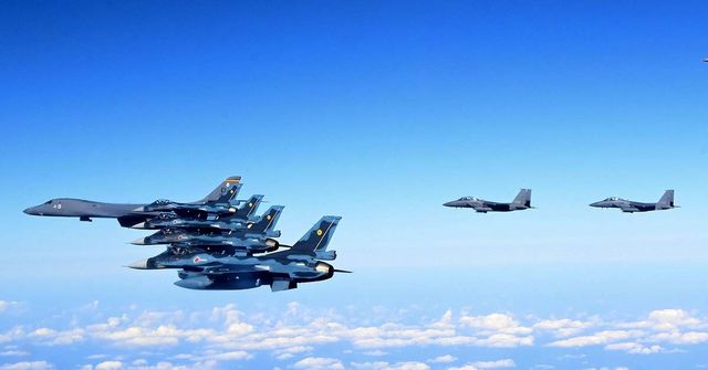 한미일 3국이 지난 3일 한반도 인근에서 공중훈련을 실시하고 있다. 당시 훈련은 지난 31일 북한의 ICBM 발사에 대응하는 차원에서 실시됐다. 미국의 전략폭격기 전개와 연계해 한국 공군의 F-15K·KF-16 전투기와 미국 공군의 F-16 전투기 그리고 일본 항공자위대의 F-2 전투기가 참가했다. / 미 공군 제공