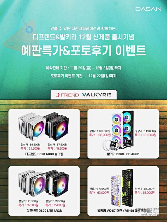 다산코퍼레이션은 발키리 B360 수랭쿨러, VK99 쉐도우잉크 한글 키보드, VK87 마린 텐키리스 키보드, 디프렌드 D620 ARGB 솔더링, D620 ARGB Lite 공랭쿨러 등 8종의 신제품을 대상으로 11월 29일부터 12월 8일까지 예약 특가 판매와 포토 후기 이벤트를 진행한다고 밝혔다.