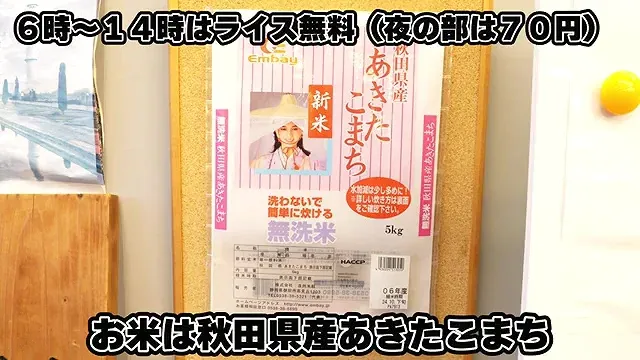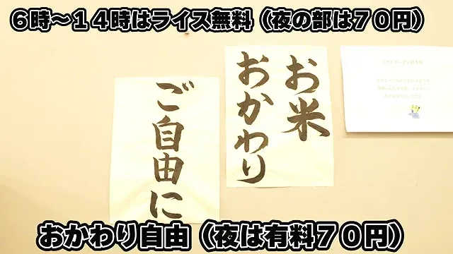 아침부터 점심 타임에는 밥이 무료고 저녁에는 70엔이다.