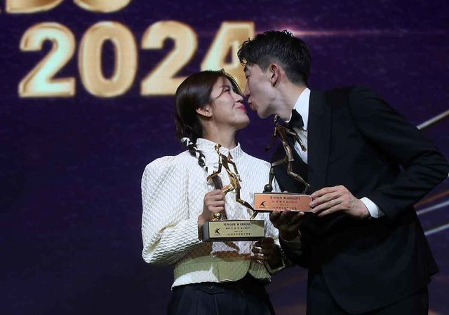 조현우(울산HD)가 29일 오후 서울 서대문구 스위스그랜드호텔에서 열린 프로축구 '하나은행 K리그 2024 대상 시상식'에서 K리그1 MVP를 수상한 후 아내와 키스하고 있다. / 뉴스1