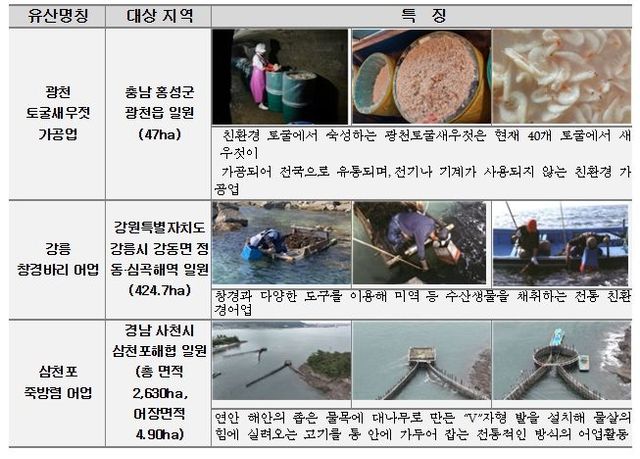 이번에 국가중요어업유산으로 지정된 제14호 ‘강릉창경바리어업’은 ‘창경(窓鏡)’이라는 도구를 이용해 수중에서 맑은 시야를 확보하여 해조류 및 저서생물 등을 채취하는 어업이다. 제15호 ‘광천토굴새우젓가공업’은 자체적으로 수분을 생성하는 풍화암 재질로 이루어진 친환경 토굴에서 새우젓을 숙성・발효시키는 가공업이다. 제16호 ‘삼천포죽방렴어업’은 연안의 좁은 물목에 대나무로 만든 ‘V’자형 발을 설치해 물살의 힘에 실려 오는 물고기를 통 안에 가두어 잡는 전통적인 어업방식이다.