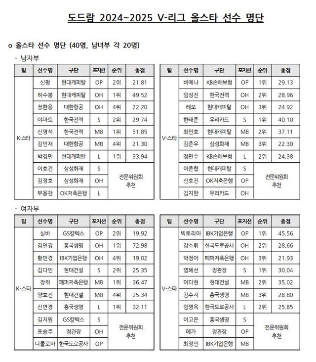 올스타전에 처음 출전하는 선수도 꽤 있다. 이번 시즌 아시아쿼터로 V-리그에 첫발을 내디딘 남자부 야마토(한국전력)와 신펑(현대캐피탈), 그리고 여자부 장위(페퍼저축은행)가 그 주인공. 여기에 V-리그 5년 차를 맞이한 비예나(KB손해보험)와 김정호(삼성화재)도 첫 기쁨을 누렸다. 이와 더불어 전문위원회 추천으로 남자부 이준협(현대캐피탈)과 신호진(OK저축은행) 등이 처음으로 올스타 선수들과 호흡하게 됐다.