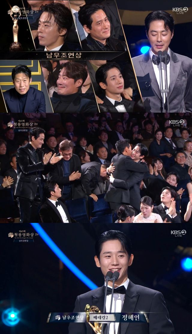 이날 남우조연상에는 구교환(탈주), 박해준(서울의 봄), 유해진(파묘), 이희준(핸섬가이즈), 정해인(베테랑2)이 후보에 이름을 올렸고, 정해인이 수상했다.