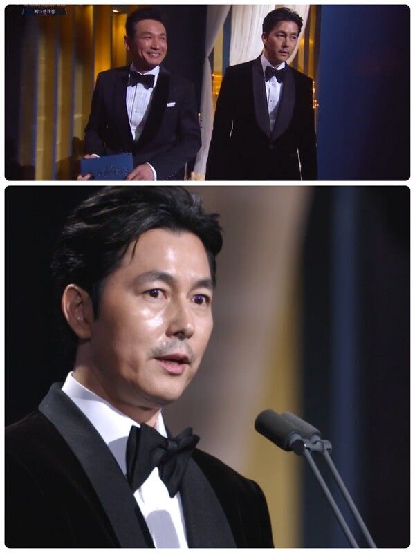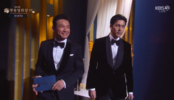혼외자 논란에 휩싸인 배우 정우성이 오늘(29일) 청룡영화제에 참석해 최다관객상 시상자로 배우 황정민과 함께 나섰습니다.