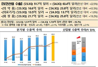 진흥원 이병관 바이오헬스혁신기획단장은 “2024년 3/4분기 보건산업 수출은 상반기에 이어 화장품과 의약품에서 역대 분기 최대 실적을 달성하며 보건산업 수출 증가를 주도했다. 4/4분기에도 바이오의약품과 기초화장용 제품류 등 주력 품목의 수요지속으로 보건산업 수출의 증가 폭은 더욱 커질 것으로 예상된다.”라고 밝혔다.