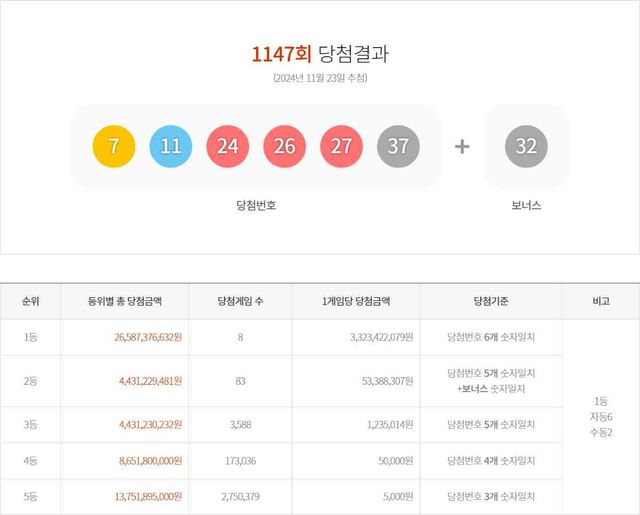 11월 23일 추첨 된 1147회 1등 당첨번호는 '7, 11, 24, 26, 27, 37' 보너스 번호는 '23' 번이다.