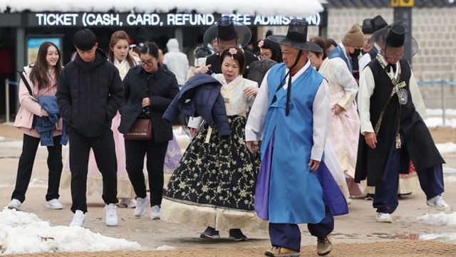 29일 서울 종로구 경복궁에서 한복을 입은 외국인 관광객들이 발걸음을 옮기고 있다. / 뉴스1