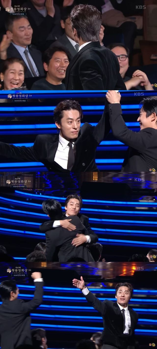정해인과 뜨거운 포옹까지 나눈 구교환은 스포츠 선수가 세리머니를 하듯 두 팔을 벌려 수상의 기쁨을 누렸다. 이를 본 배우들은 한마음으로 손뼉을 치며 뜨겁게 호응했다.