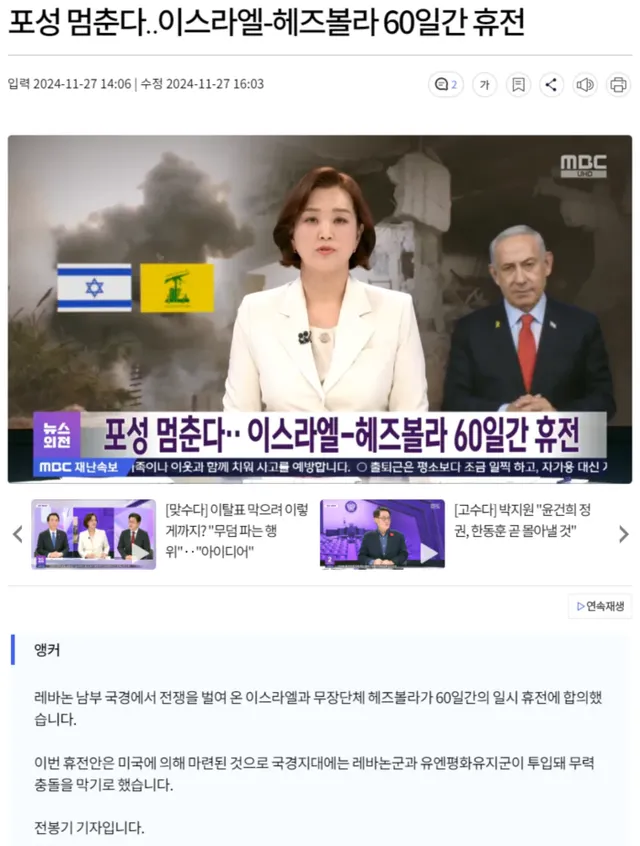 포성 멈춘다.. 이스라엘-헤즈볼라 60일간 휴전