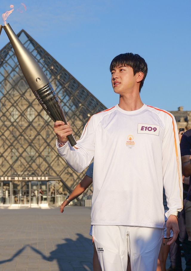 그룹 방탄소년단(BTS)의 진이 지난 7월 14일(현지 시각) 프랑스 파리에서 '2024 파리 하계 올림픽' 성화 봉송을 하고 있다. / 뉴스1=2024 파리올림픽 조직위원회