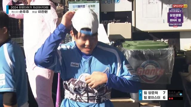 30일 부산 사직구장에서 열린 '제12회 희망더하기 자선야구대회'에서 BJ과즙세연 코스프레하기 위해 입은 옷 고쳐 입는 황동재(삼성) / 유튜브 'MBC Sports+'