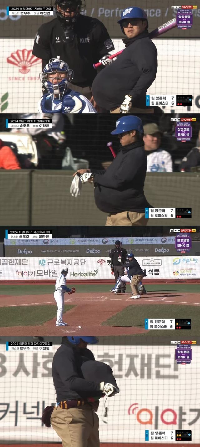 30일 부산 사직구장에서 열린 '제12회 희망더하기 자선야구대회'에서 방시혁 하이브 의장 코스프레하고 타석 등장한 김민수(삼성) / 유튜브 'MBC Sports+'