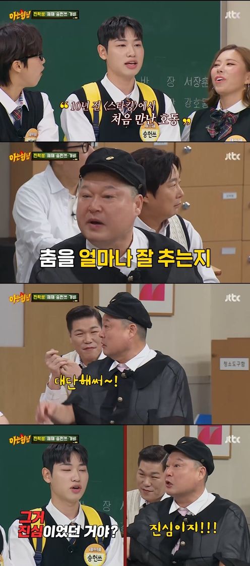 승헌쓰는 "내가 10년 전에 스타킹에 나가서 호동이를 만난 적 있었다"라고 했고, 강호동은 "대단했다. 춤을 얼마나 잘 추는지 모른다"라고 당시를 회상했다.