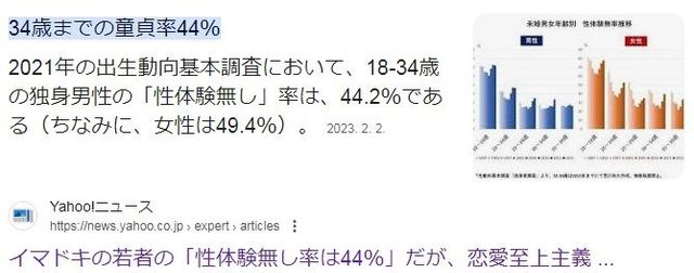 그리고 아랫 사진은 21년 출생 동향 기본 조사에서 18-34세 독신 남성의 성경험 없는 비율은 44.2%(여성은 49.4%)