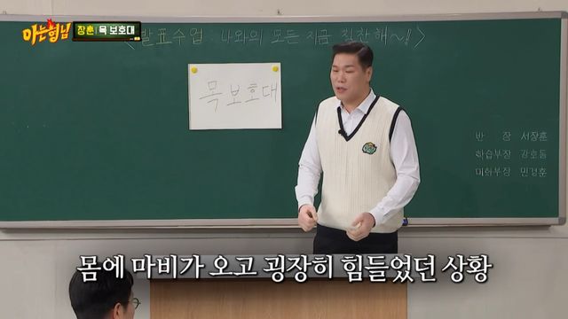 이날 서장훈은 목 보호대라 적은 스케치북을 칠판에 붙인 후 "저는 원래 기본적으로 내 자신을 칭찬하는 걸 별로 좋아하지 않는다"라며 토크를 이어갔다.