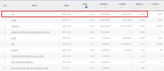 영화 '1승' 박스오피스 실시간 예매율. / 영화관입장권통합전산망