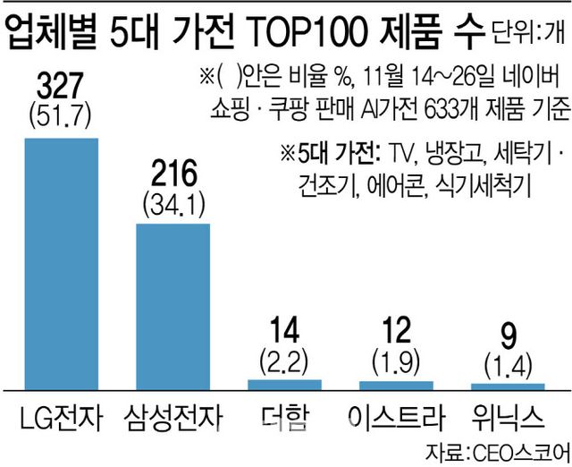 1일 기업데이터연구소 CEO스코어에 따르면 네이버 쇼핑과 쿠팡의 5대 가전 품목별 ‘톱100’에 포함된 제품 총 1000개를 조사한 결과 AI 가전제품은 633개로 이중 LG전자 제품은 절반(51.7%)이 넘는 327개로 집계됐다. 삼성전자(005930) 제품은 216개(34.1%)였다.