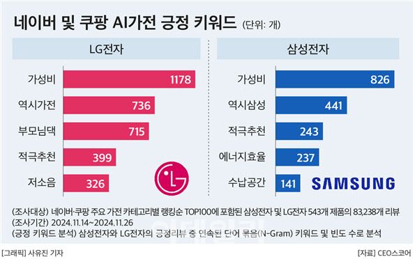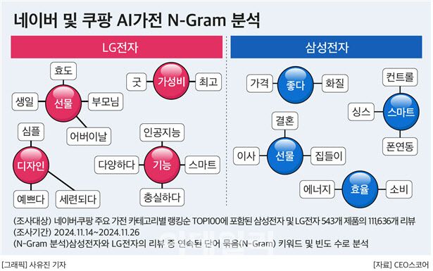 CEO스코어는 실제 고객이 남긴 리뷰를 엔그램(N-Gram) 기법으로 분석한 결과 LG전자에 대해선 세련되고 간단한 디자인, 다양한 AI 기능, 가성비 등 키워드가 다수 언급됐다고 밝혔다. 특히 어버이날이나 부모님 생신 등 효도 선물로 LG AI 가전제품을 추천하는 고객이 많았다.
