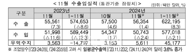 안덕근 산업부 장관은 “11월에는 자동차 부품업체 파업에 따른 자동차 생산 감소, 기상악화로 인한 수출 물류 차질 등 우리 수출에 예상치 못한 부정적 요인이 발생했다”며 “그럼에도 반도체·선박 등 주력 품목 호조세에 힘입어 14개월 연속 수출 플러스, 18개월 연속 무역수지 흑자를 기록할 수 있었다”고 평가했다.