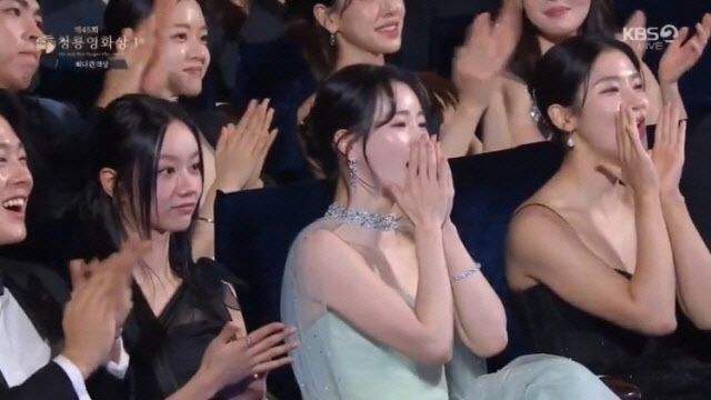 약 1분여 동안 이어진 정우성의 발언 직후 객석에서는 동료 배우들의 뜨거운 환호와 함께 응원의 박수가 쏟아졌다. 다만 카메라에 순간 포착된 혜리의 표정은 좀 달랐다. 상대적으로 냉소적인 표정으로 박수만 치고 있는 상반된 태도를 보인 것.