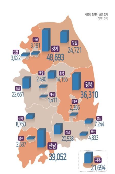 국토교통부의 '외국인 토지·주택 보유 통계'에 따르면 올해 상반기 기준 외국인이 보유한 도내 토지면적은 2183만3000㎡다. 보유 토지의 공시지가는 5891억원이다. 전년 동기 대비 면적은 0.6%, 금액은 2.0% 증가했다.