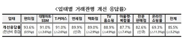 업태별로 온라인쇼핑몰은 69.3%의 가장 낮은 개선 응답률을 기록했다. 지난해에는 80.6%였다. 다만 편의점은 개선 응답률이 93.6%를 보이며 가장 높았다. 그 다음 대형마트·SSM이 91.0%, T-커머스 91.0%로 뒤를 이었다.