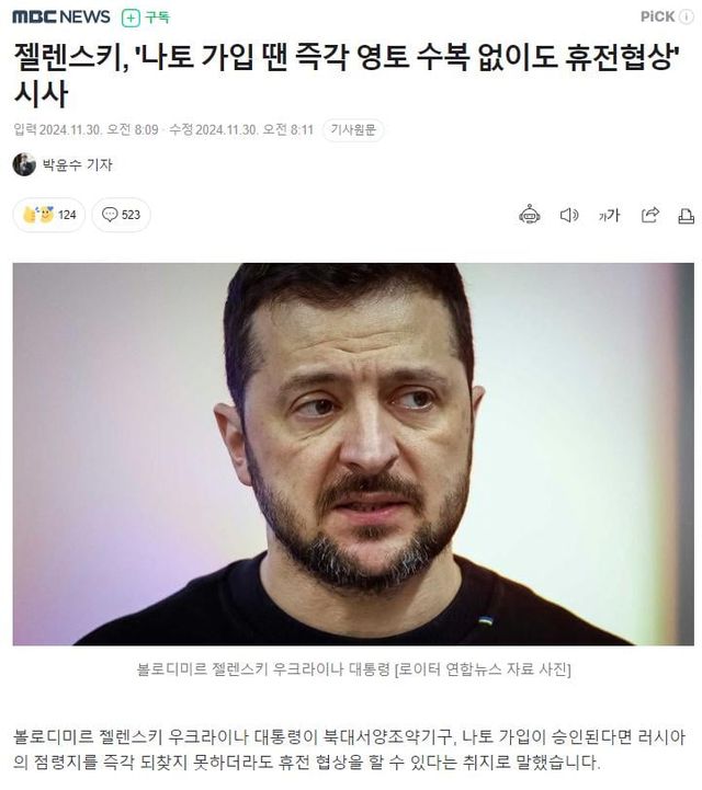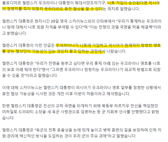 나토에 가입시켜주면 지금 잃은 영토를 내어줘도 휴전하겠다고 함.