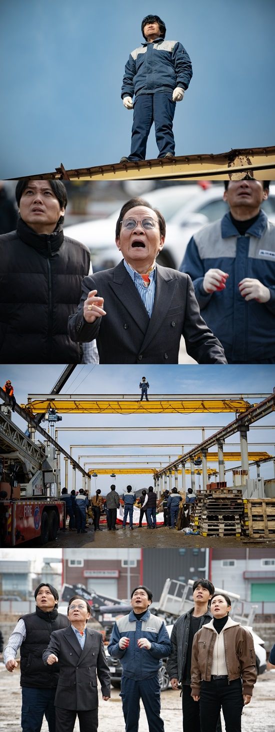 우현과 박노식의 특별 출연이 눈길을 끄는 가운데, 공개된 사진에는 높은 크레인 위에 올라간 노동자 양복규(박노식 분)의 모습이 담겨 있다.