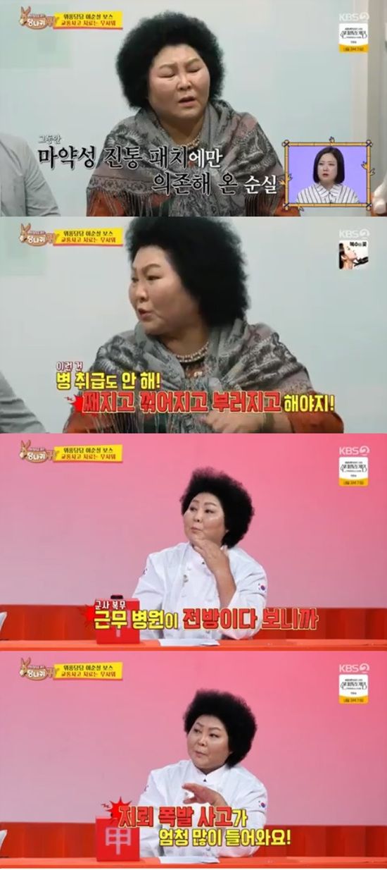 이순실은 스튜디오에서도 "제가 전방에 있었다. 지뢰 폭발 사고 환자가 엄청 많이 들어온다. 신경도 안 쓴다"고 얘기했다.