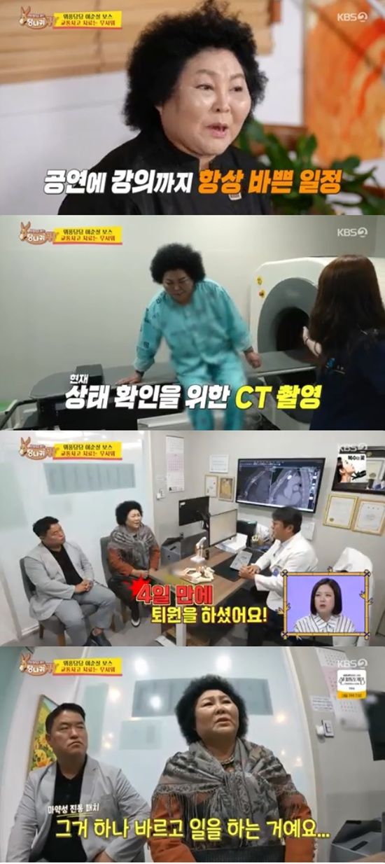 장이사는 "대표님이 기침만 살짝 해도 아프시다고 한다. 사고 후 후유증 있으신 것 같다. 그 고통을 참고 일만 하시더라"라고 이순실을 병원으로 데려간 이유를 얘기했다.