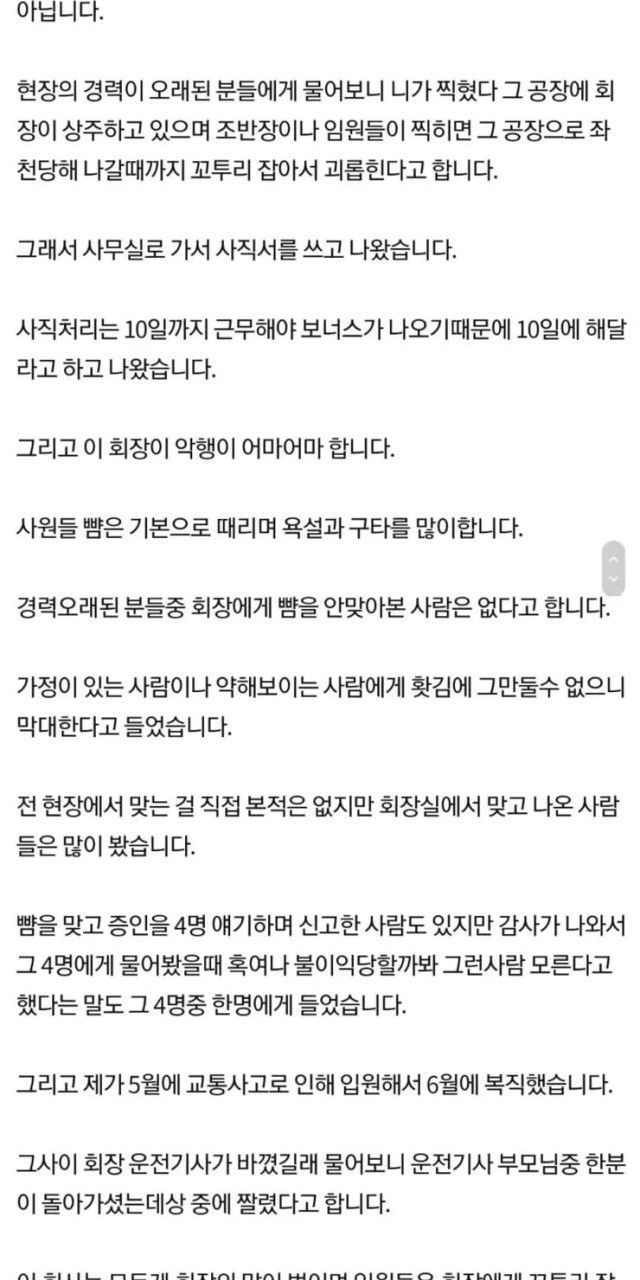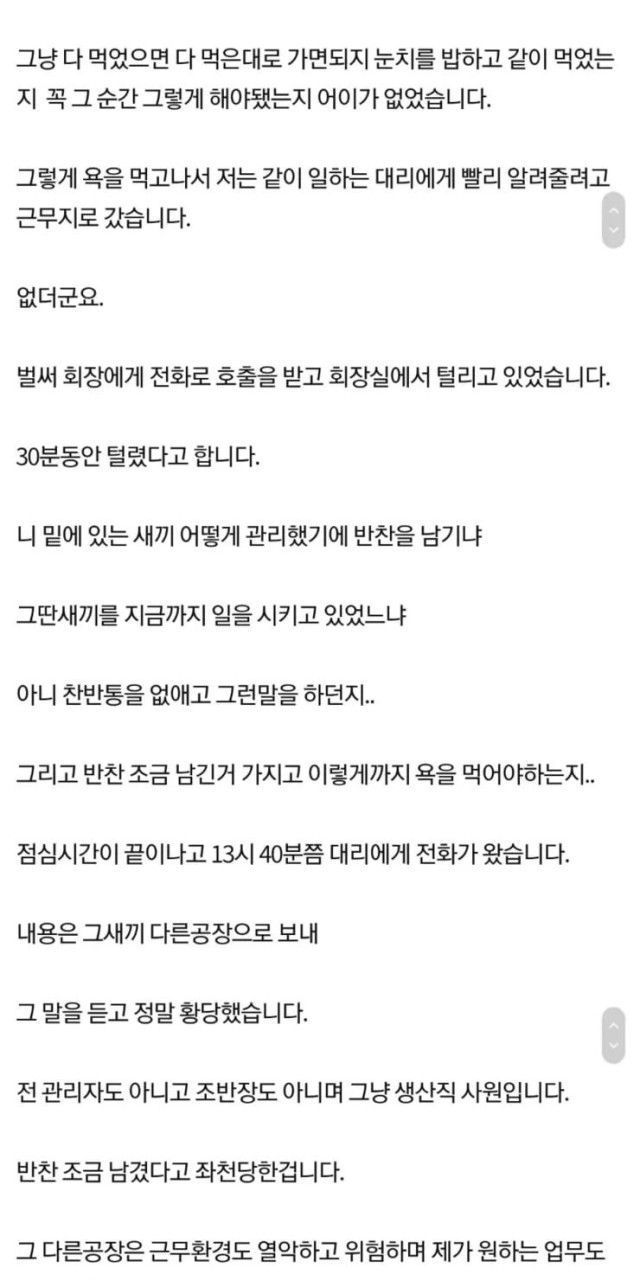 밥 먹다가 회장에게 쌍욕 먹고 퇴사했습니다