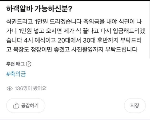 최근 중고거래 플랫폼 ‘당근’에는 예비 신랑 A씨가 하객 아르바이트를 구하는 글을 올렸다.