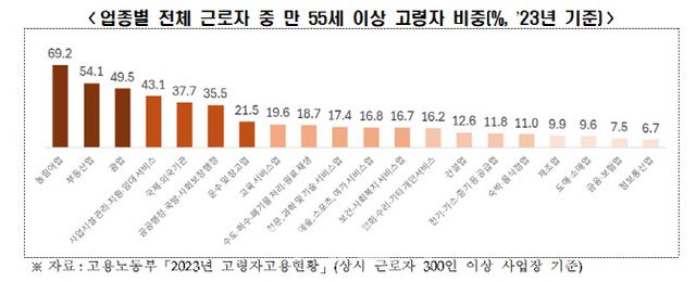 보고서는 “업종별, 기업별 사정에 따라 고령 근로자의 지속적인 고용 필요성이 달라 정년과 관련한 사항은 기업 자율에 맡겨야 할 사안”이라고 언급했다. 실제로 고용노동부 「2023년 고령자고용현황」 조사에 따르면 업종 간 55세 이상 고령자 비중 격차가 최대 62.5%p(△농림어업 69.2%(1위) △정보통신업 6.7%(최하위))에 달하는 것으로 나타났다.