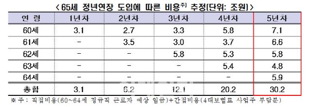 보고서는 상기 추정 결과를 바탕으로 65세 정년연장으로 근로자의 고용을 64세까지 유지하는 데 소요되는 비용을 추정했다. 추정 결과 65세 정년연장 도입 1년 차에는 60세 정규직 근로자 고용에 따른 비용이 3.1조원인 것으로 분석됐다. 한편 60~64세 모든 연령대의 정규직 근로자가 정년연장의 적용대상이 되는 도입 5년 차에는 비용이 30.2조원에 달하는 것으로 분석됐다.