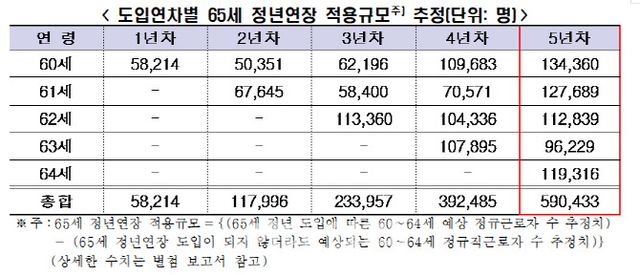 추정 결과 65세 정년연장 도입 1년 차에는 60세 정규직 근로자의 고용이 연장되며, 예상 규모는 5.8만 명인 것으로 분석됐다. 한편 도입 5년 차에는 60~64세 모든 연령대의 정규직 근로자가 정년연장의 적용대상이 된다. 예상 규모는 59.0만 명에 달하는 것으로 분석됐다.