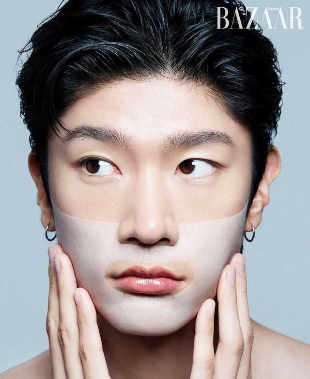 모델이 사용한 제품은 아이디얼 포 맨의 ‘시카 애프터 쉐이빙 마스크’. 면도 후 부착하는 마스크 팩으로 진정, 쿨링, 수분 공급에 집중한다. 남성의 하관에 맞도록 설계되었다.