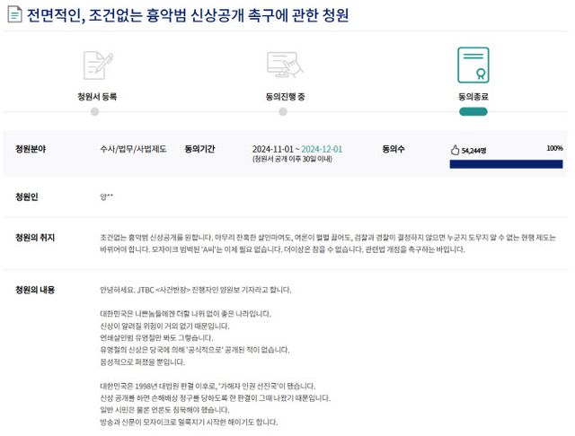 2일 국회 국민동의청원 홈페이지에 따르면 ‘전면적인, 조건없는 흉악범 신상공개 촉구에 관한 청원’이 전날 동의 수 5만 명을 넘겼다.