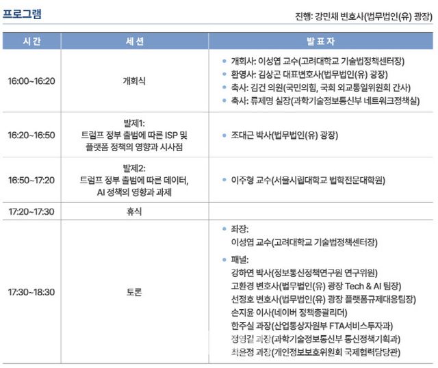 첫 세션에서는 광장의 조대근 박사가 ‘트럼프 정부 출범에 따른 ISP 및 플랫폼 정책의 영향과 시사점’에 대해 발표한다. 지난 2022년 광장에 합류한 조대근 박사는 통신 및 ICT 규제정책 분야에서 약 20년 동안 경력을 쌓아온 규제정책 전문가다. 이어지는 두번째 세션에서는 이주형 서울시립대학교 법학전문대학원 교수가 ‘트럼프 정부 출범에 따른 데이터, AI 정책의 영향과 과제’에 대해 발표한다.