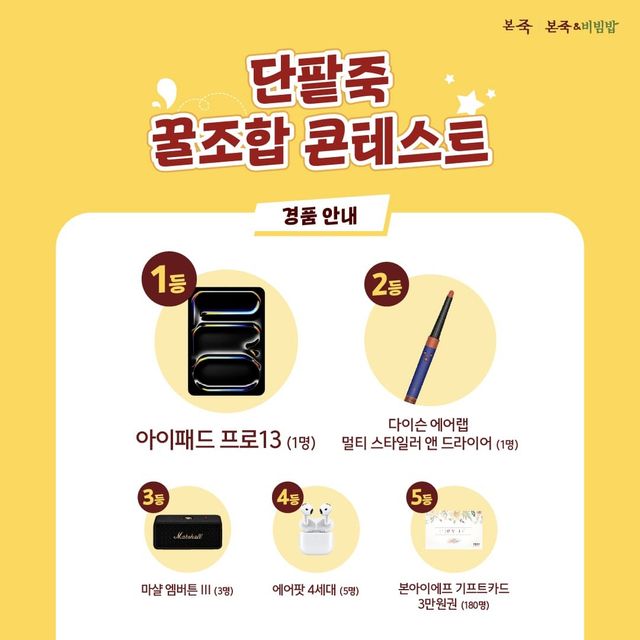 콘테스트에 참여하는 고객들을 위한 풍성한 사은품 혜택도 마련됐다. 참여자 중 총 190명을 선정해 아이패드 프로 13, 다이슨 에어랩 멀티 스타일러 앤 드라이어, 마샬 엠버튼3, 에어팟 4세대, 본아이에프 기프트카드 3만 원권 등 1,000만 원 상당의 다채로운 경품을 증정할 예정이다. 당첨자는 오는 12월 13일 개별 안내되며, 선정된 수상작은 본죽 공식 SNS 채널을 통해 소개될 예정이다.