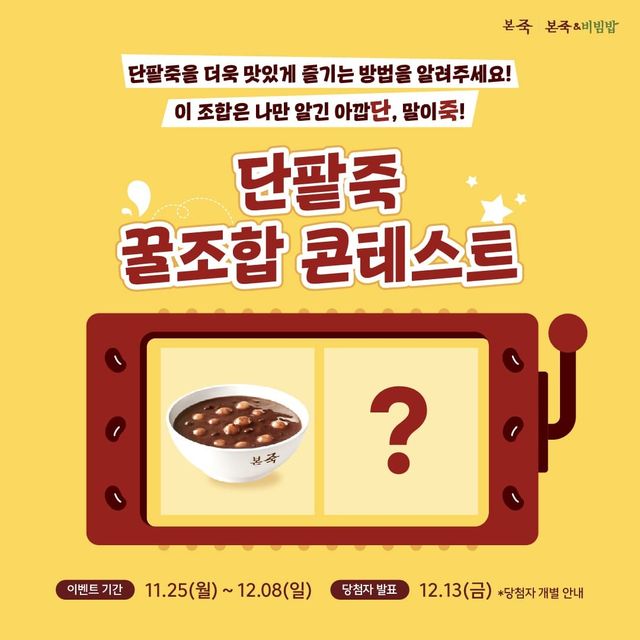 콘테스트는 개인 SNS 계정을 통해 누구나 참여할 수 있다. 상품을 구매한 후, 자신만의 꿀조합을 만들어 필수 해시태그(#단팥죽, #동지, #팥죽, #본죽)와 함께 개인 인스타그램 또는 블로그에 공유하면 된다. 이후 공식 홈페이지 내에서 이벤트 참가신청서를 작성하면 참여 완료다.