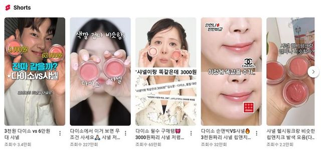 유튜브 쇼츠에 올라온 다이소 립앤치크 제품 비교 후기 영상. ⓒ 유튜브