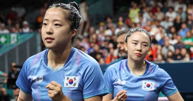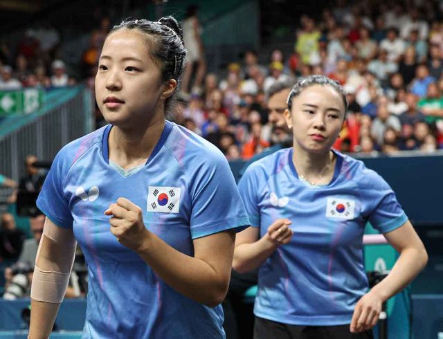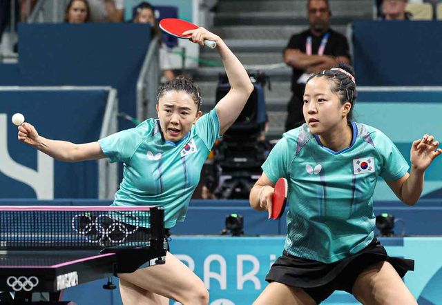 대한민국 탁구 대표팀 신유빈, 전지희가 8월 10일(한국시간) 프랑스 파리 사우스 파리 아레나4에서 열린 '2024 파리올림픽' 탁구 여자 단체 동메달 결정전 독일의 완위안, 샤샤오나와 맞대결을 펼치고 있다. / 뉴스1