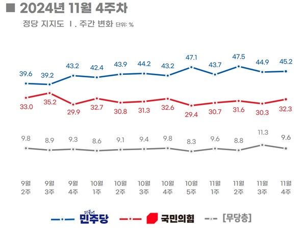 국힘 32.3%·민주 45.2%.. 양당 격차 14.6%P → 12.9%P