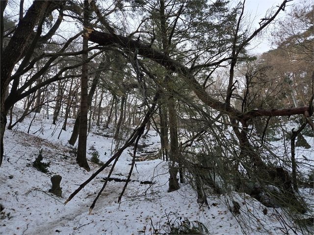 (경기=뉴스영 공경진 기자) 경기도 남한산성에서, 기록적인 폭설로 다수의 소나무가 쓰러지고 부러지는 피해가 발생해 문화유산과 자연생태계가 동시에 위협받고 있다. 특히 산책로를 막거나 전력선 위에 걸쳐진 나무들로 인해 2차 사고 위험이 커지며 복구 작업의 시급성이 강조되고 있다.
